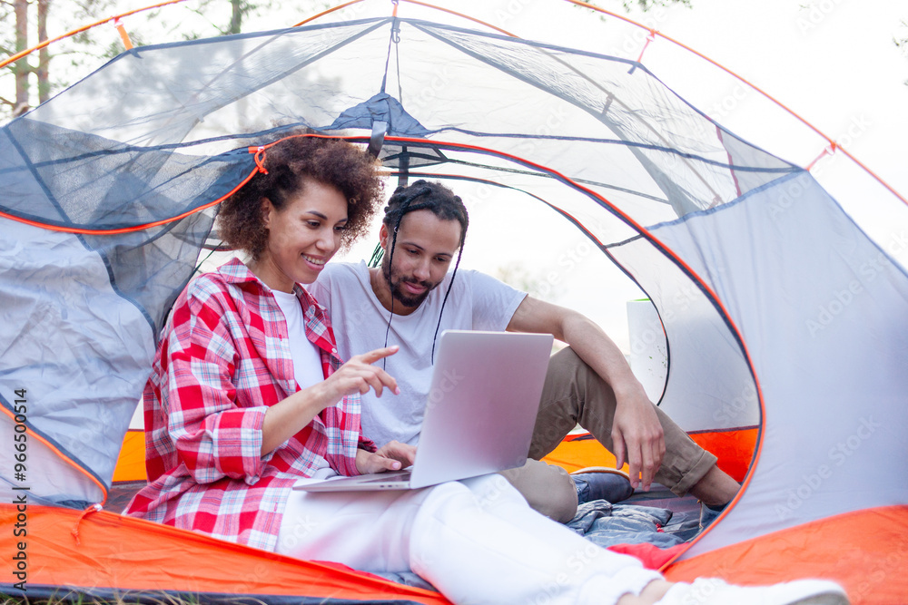 young african american couple hikers sitting in tent in forest using laptop, man and woman freelancers traveling with tents and working online on computer