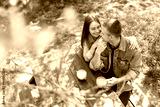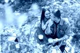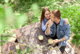 young married couple in denim clothes sitting in the garden at a wooden table and drinking coffee on a date in the summer, girl and guy having breakfast in an outdoor cafe and chatting
