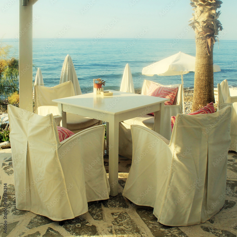 white tables and chairs in greek cafe by sea coast, Greece