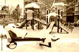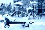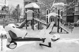 A winter wonderland unfolds in the city with a snowcovered playground featuring a slide and swings, surrounded by natures beauty and freezing temperatures