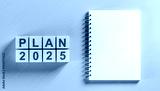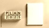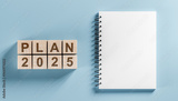 mockup calendar 2025 time for new Year, new start. Plan words and 2025 cubes wooden table background. plans for 2025, space for your text on notepad