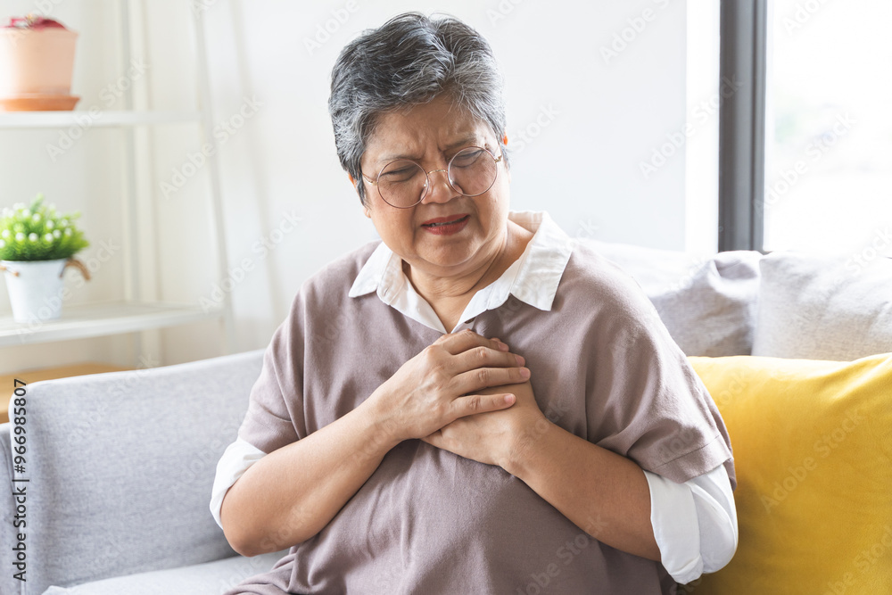 Chest pain, attack chest, emergency heartbeat asian senior woman holding hand on chest, suffering symptom from pain, heart disease problem of aged anxiety cardiac. Health care of cardiology concept.