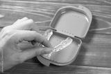 Woman takes Dental splint mouth guard from the box. TMJ splint disorder treatment. Occlusal splint. Prevent bruxism. Mouth guard for TMJ. Teeth protection. Pain in jaw. Teeth grinding.