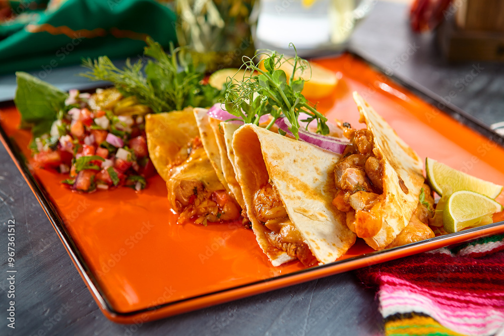 Delicious Mexican Quesadilla with Lime and Vegetable Salsa on Tortilla Wrap