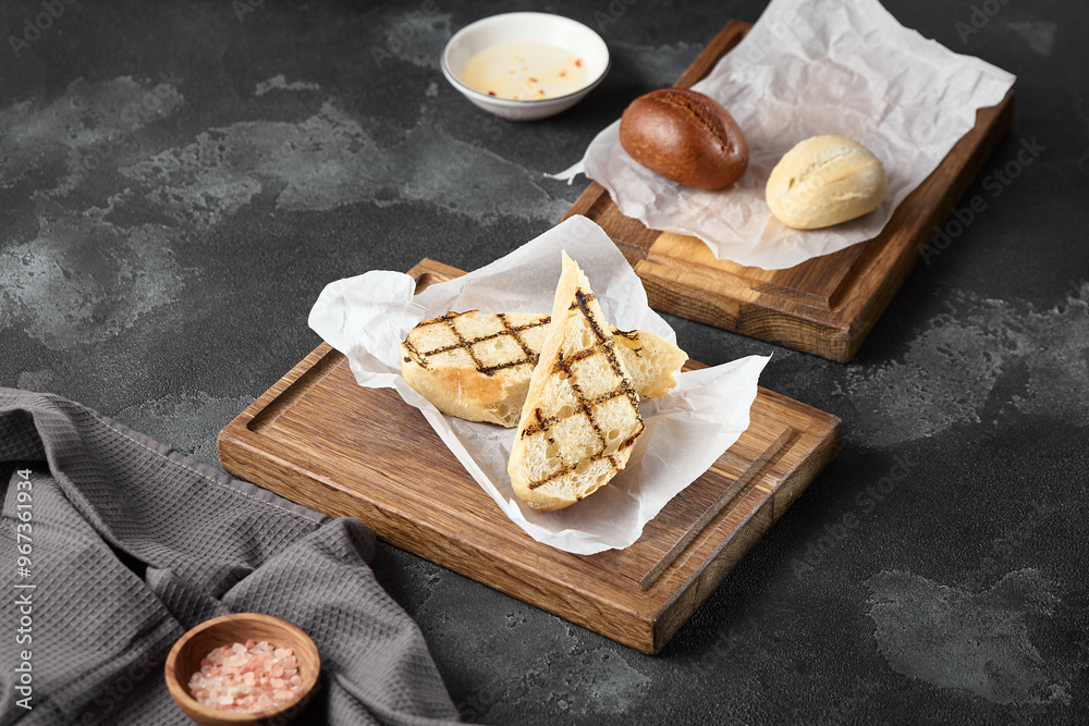 Assorted Bread Display on Rustic Wooden Boards with Grilled Slices and Seasoning