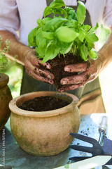 Gardener planting basil in a clay pot filled with soil, outdoor gardening scene