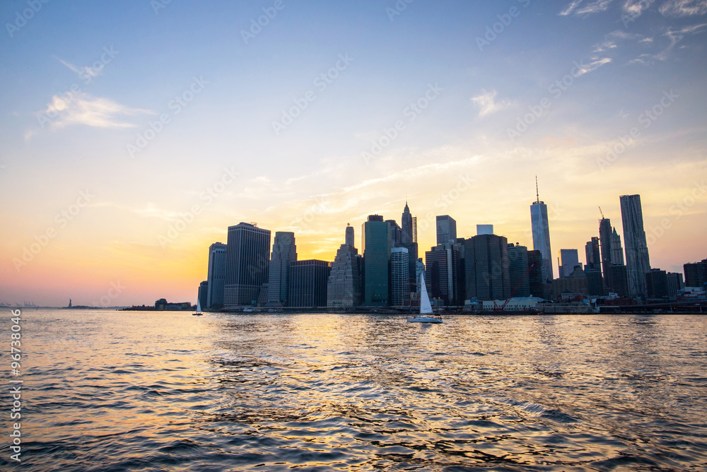 sailing boats at dusk in front of manhattan, new-york city