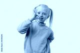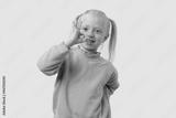 Cute little girl with blond hair, dressed in a yellow sweater, showing OK sign with both hands, isolated on white background
