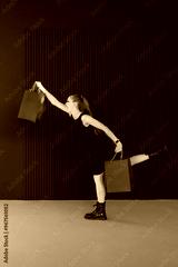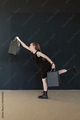 Young happy woman running with black shopping bags, successful shopping, seasonal discount. Black Friday sales. Full length portrait