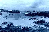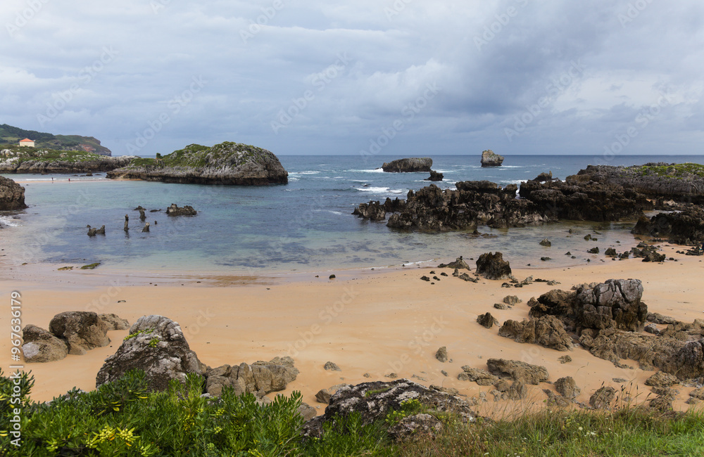 Cantabria, Spain, beach Playa de Ris in town of Noja, with karst formations and several small islets offshore