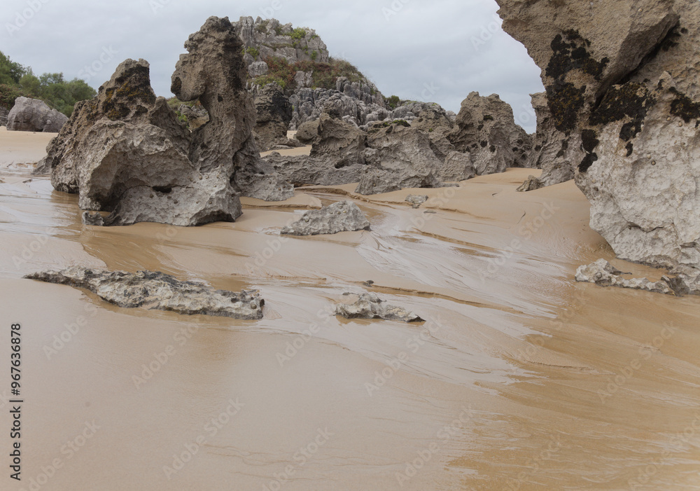 Cantabria, Spain, beach Playa de Ris in town of Noja, with karst formations and several small islets offshore