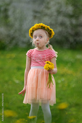 Funny little girl in pink dress and wreath of flowers makes faces. Vertical frame. Blurred background.