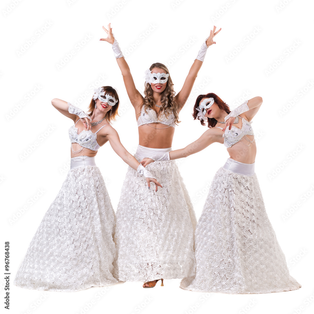 Three carnival dancer women wearing a mask dancing, isolated on white