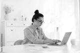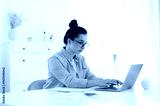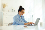 Focused serious business woman of arabian or indian ethnicity in blue shirt, digital manager, company ceo, sits at a workplace while working on a laptop, concentrated looks at a screen, searching info