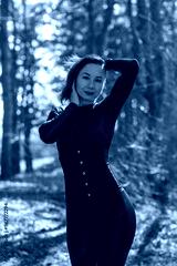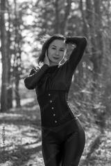 A beautiful woman in a leather catsuit poses in the forest in autumn