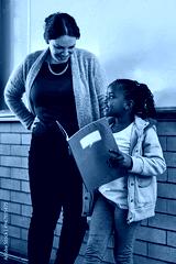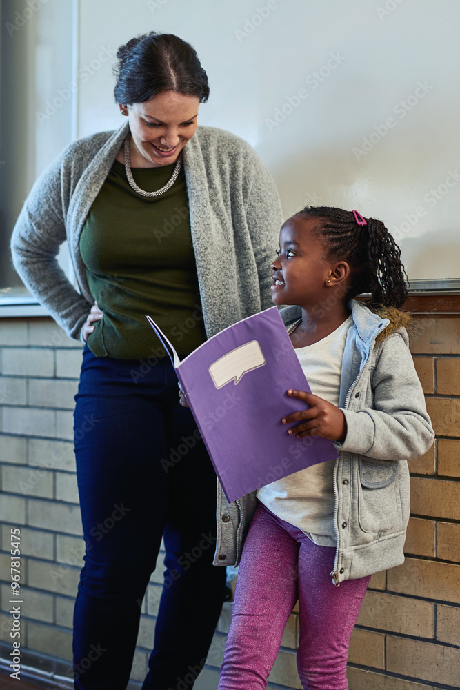 Girl, book and presentation in classroom with teacher, smile and together for development at academy. Child, oral and speech with notebook, education and learning for future with progress at school
