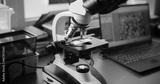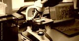 Workspace in advanced modern archaeological lab. Microscope with sample on glass slide for fossil analysis and scientific microbiological research and laptop standing on the table. Science concept.