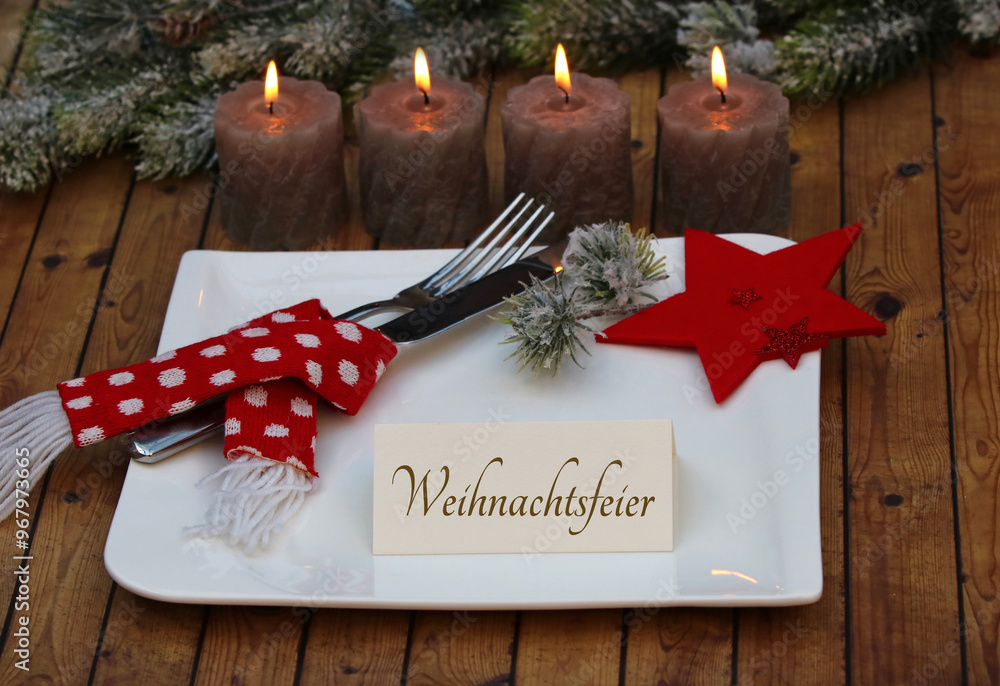 Tischdekoration zur Weihnachtsfeier. Kerzen mit Tannenzweigen und ein Tischgedeck.