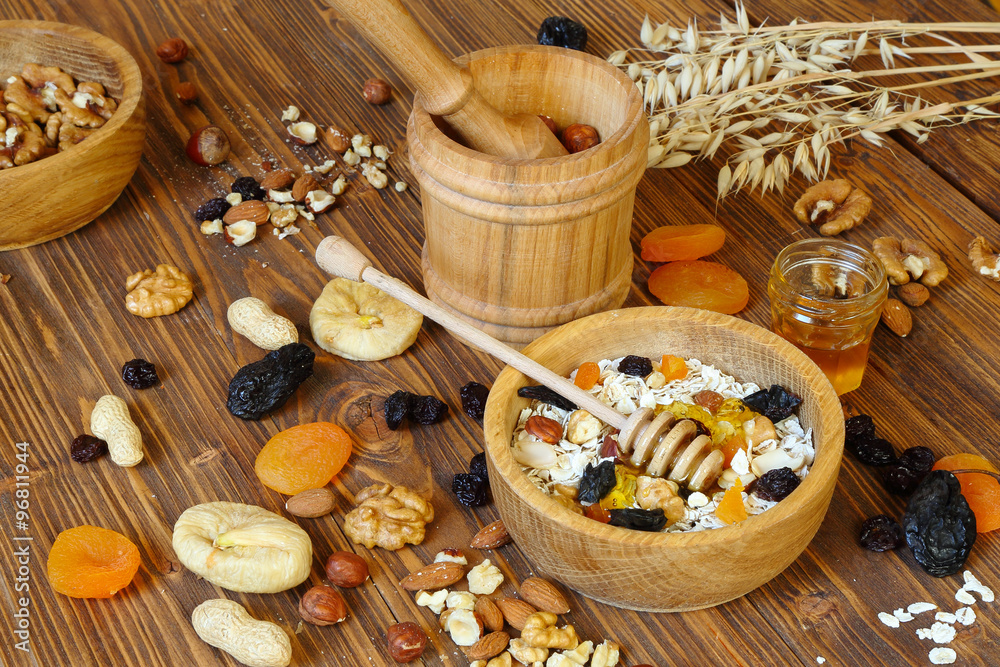Granola with oatmeal, nuts, dried fruit and honey