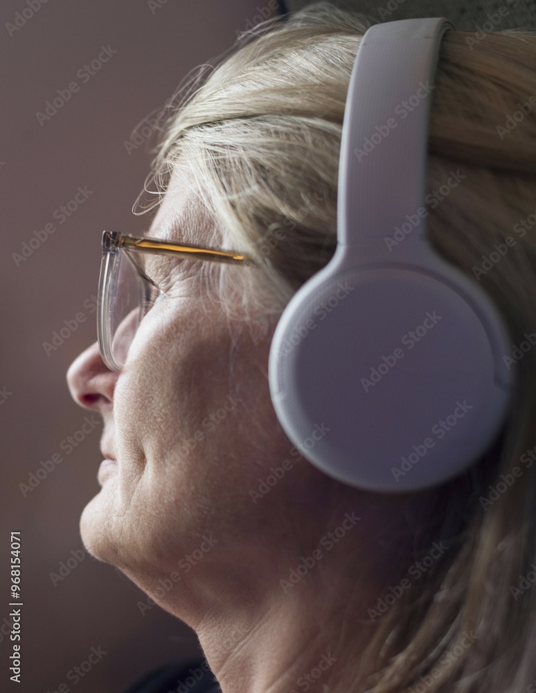 Woman sitting on a moving train listening to headphones,relaxing while looking out of a window,Worcestershire,United Kingdom.