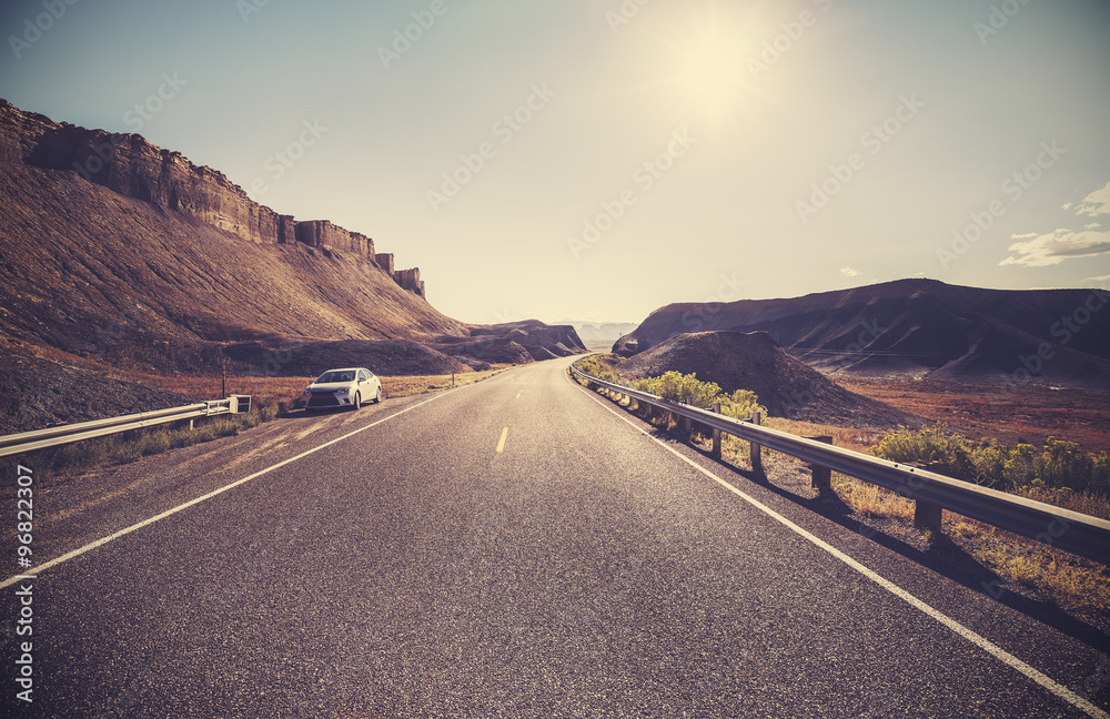 Retro toned desert highway against sun, travel concept