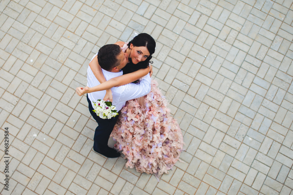 Cute adorable beautiful happy just married couple, stylish bouquet