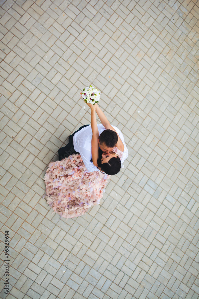 Cute adorable beautiful happy just married couple, stylish bouquet