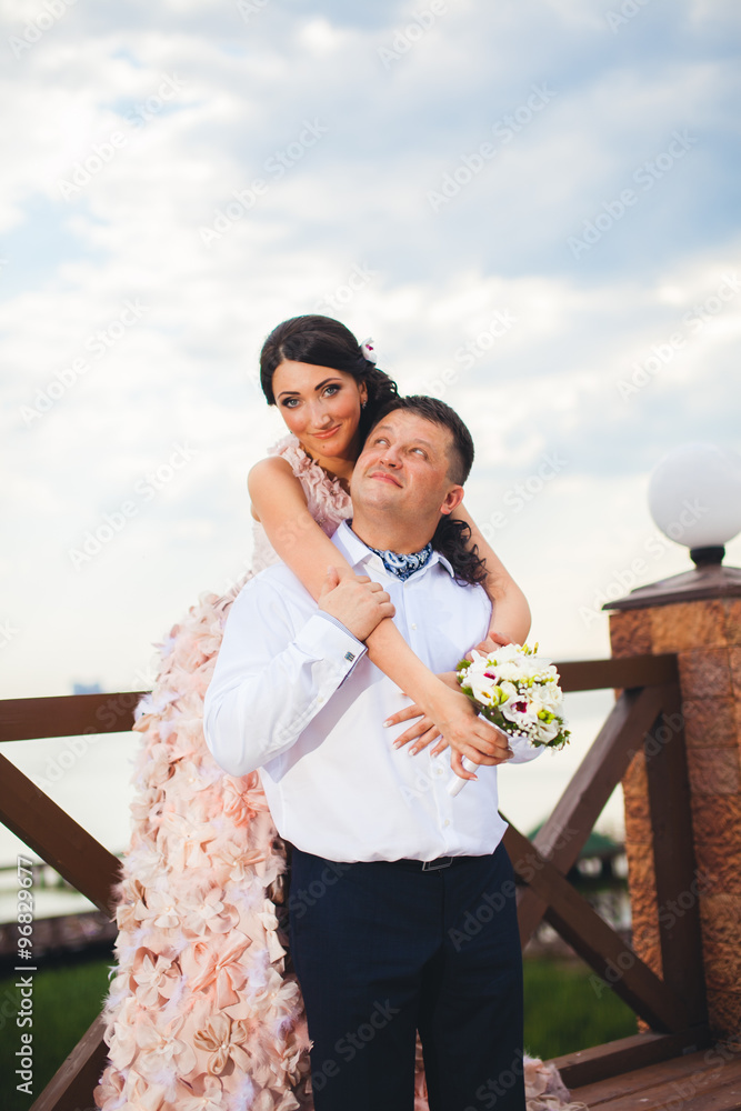 Cute adorable beautiful happy just married couple, stylish bouquet