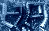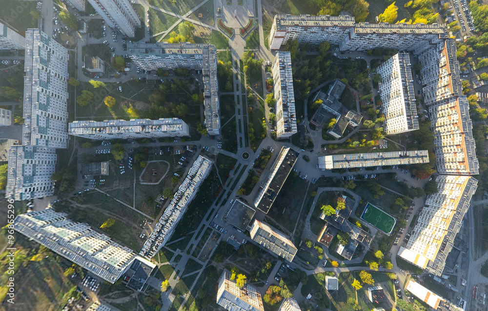 Aerial city view with crossroads, roads, houses, buildings and parks