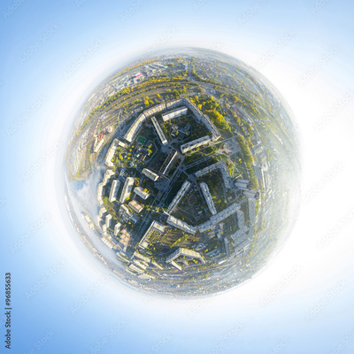 Aerial city view with crossroads, roads, houses, buildings and parks
