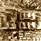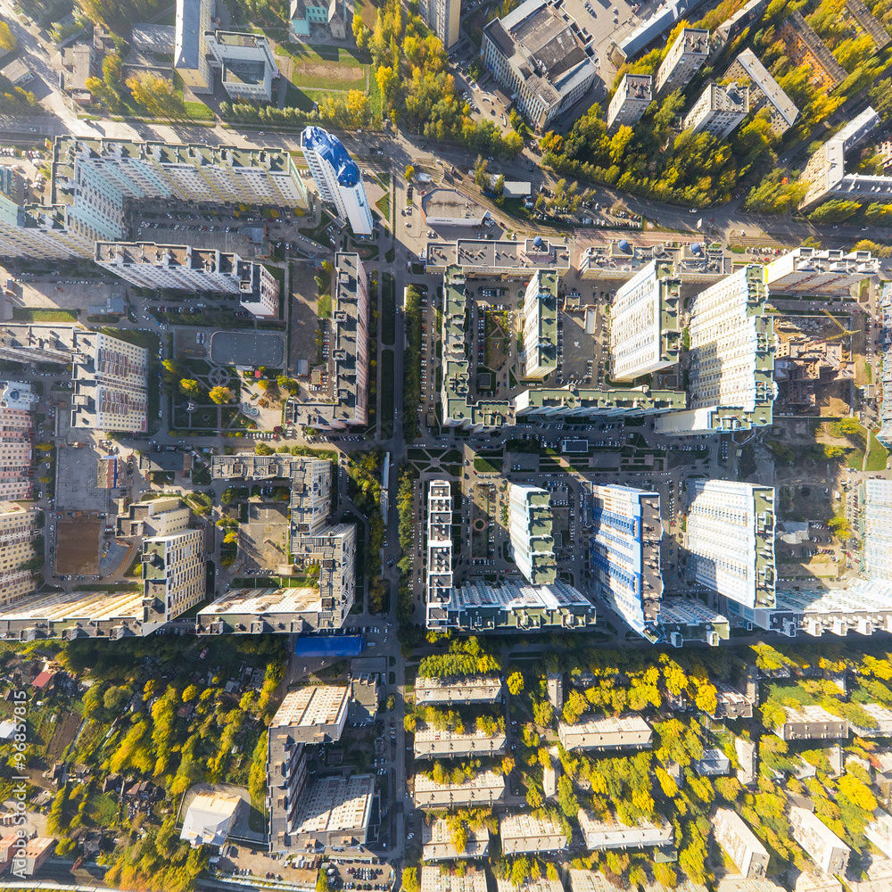 Aerial city view with crossroads, roads, houses, buildings and parks
