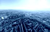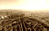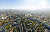 Aerial city view with crossroads and roads, houses, buildings, parks and parking lots, bridges. Copter shot. Panoramic image