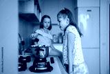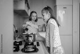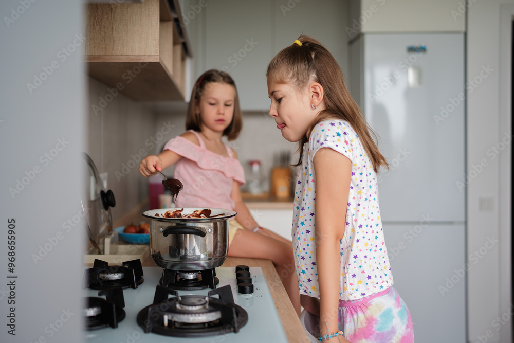 Two young girls are cooking together in a modern kitchen, exploring the joy of culinary activities and friendship. They are actively engaged in preparing food on the stove.