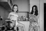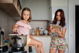 A young mother and her daughter enjoy cooking in the kitchen using a tablet for recipes, creating a joyful family moment.
