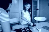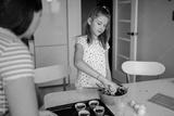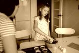 A young girl is focused on preparing cupcake batter in a modern kitchen, highlighting the joy and creativity of home baking activities.
