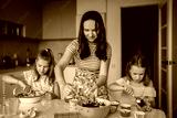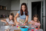 A mother and her two young daughters enjoy baking homemade chocolate cupcakes in a modern kitchen, fostering family bonding and creativity. The children are learning and having fun during the process.