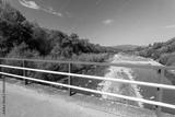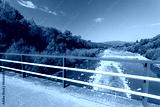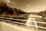 Beautiful mountain landscape on a sunny day.Natural coastline. A small amount of water in the river. Beskid Mountains. Bridge with blue and white balustrades.The Soła River. View from the "Velo Sola"