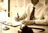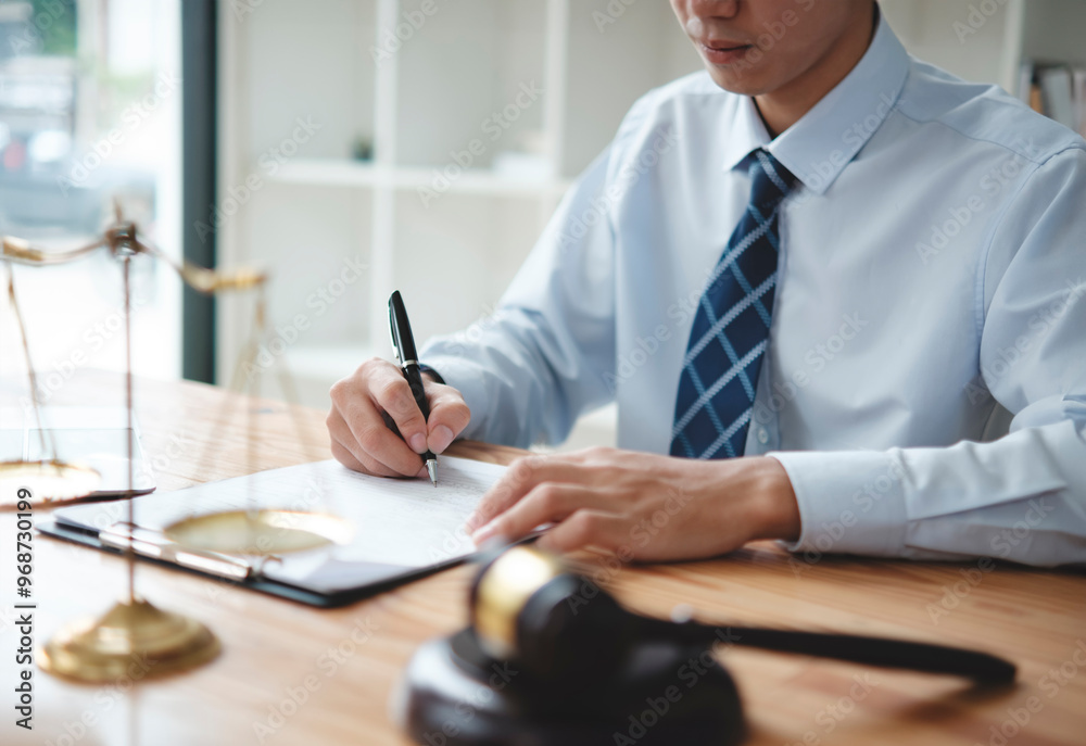 A lawyer in a suit is sitting at his desk, signing legal documents with a gavel on the side.