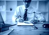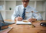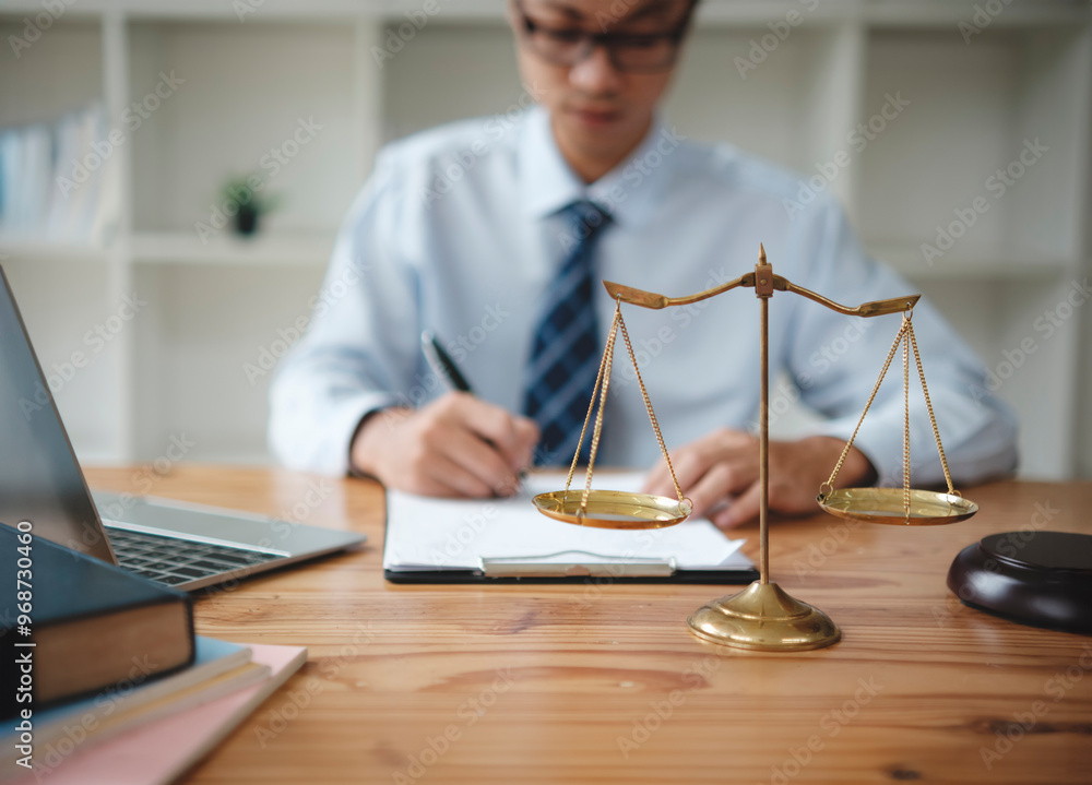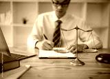 A lawyer in a suit is sitting at his desk, signing legal documents with a gavel on the side.