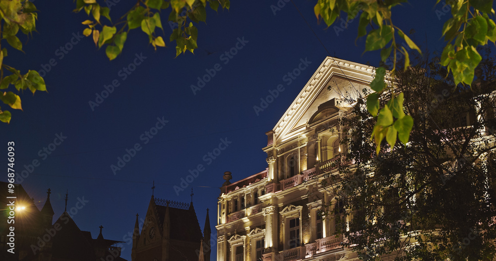 Mumbai, India. Heritage Structure Called Army And Navy Building In Night Illumination. Located In Art District Of Kala Ghoda In Mumbai. Today, Army And Navy Building Houses Various Companies Of Tata