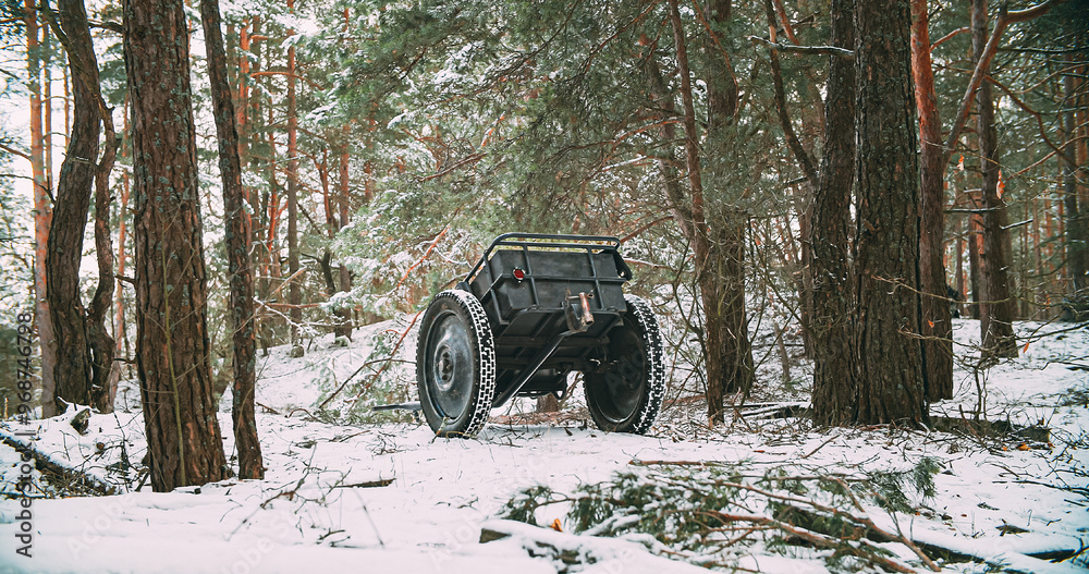 Abandoned German Infantry Cart Or Handcart Infanteriekarren If8 Of World War Ww Ii On Forest Ground. German Military Ammunition. Armed Forces Of Germany Of World War Ii. Vintage Handcart German Army