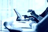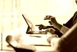 Team of business people pointing at digital tablets and pointing at charts on screen while explaining online marketing information to colleagues. Discussion. Consultation. Collaboration.