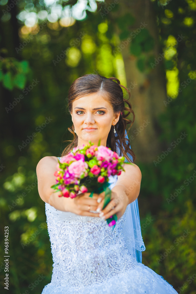 happy bride in a beautiful national park during a wedding photo shoot. eco-style