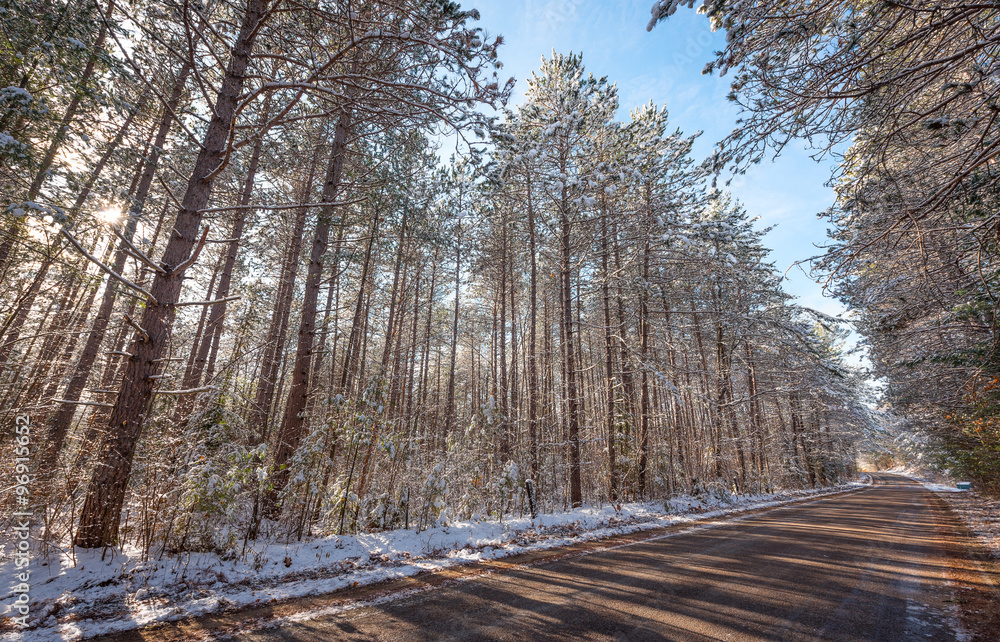 Snow covered pines - beautiful forests along rural roads. Bright sunny and frosty winter morning finds the forests draped frozen in fresh fallen snow.
