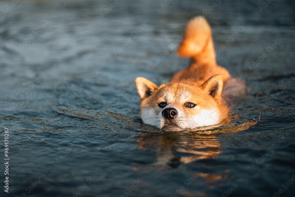 A Red Shiba Inu dog is swimming in a Baltic sea