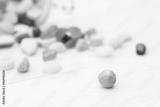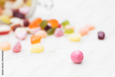 Close up of one outstanding soft pink candy, glass jar and colorful candies in background