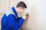Worker electrician installs an electrical outlet