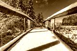 Snow covered footbridge. A fresh fallen snow covers a footbridge on a walking path in the woods. Nature winter scenic.