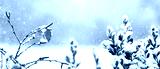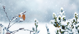 winter view during snowfall, snow-covered boxwood branches and a tree branch with dry leaves on a blurred background