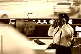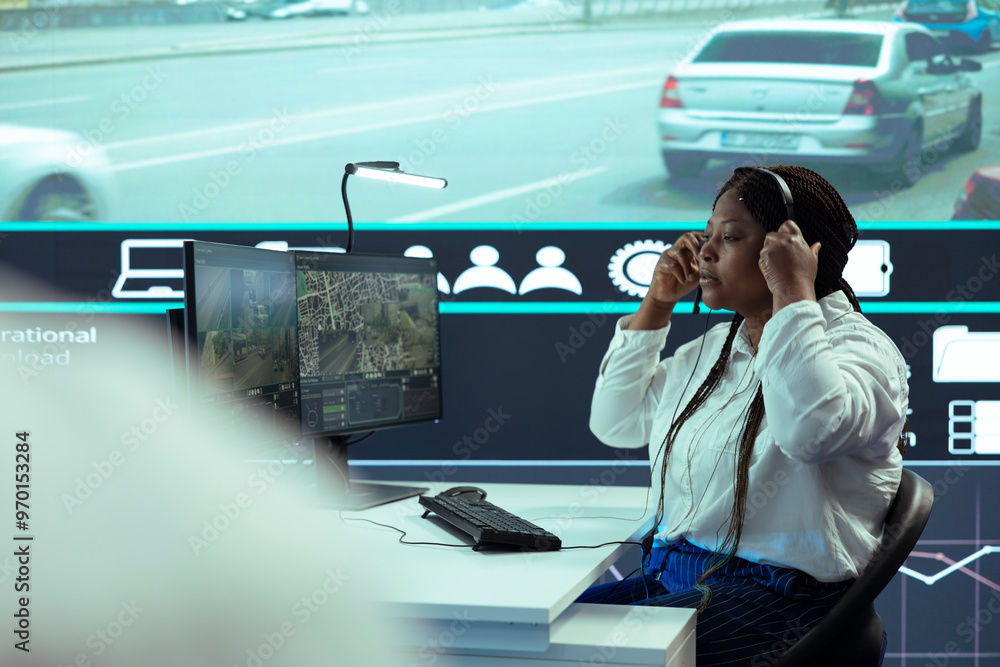 African american government employee monitoring traffic activity via surveillance footage on CCTV cameras spread around the town. Woman uses high tech security system for license plate reading.
